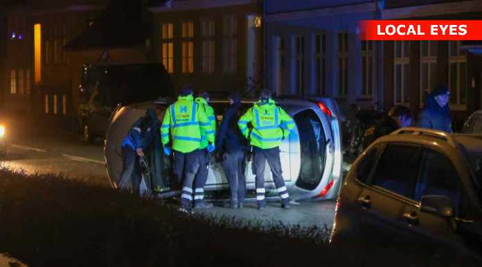 Her har indtruffet et færdselsuheld hvor en bil er endt på siden.
