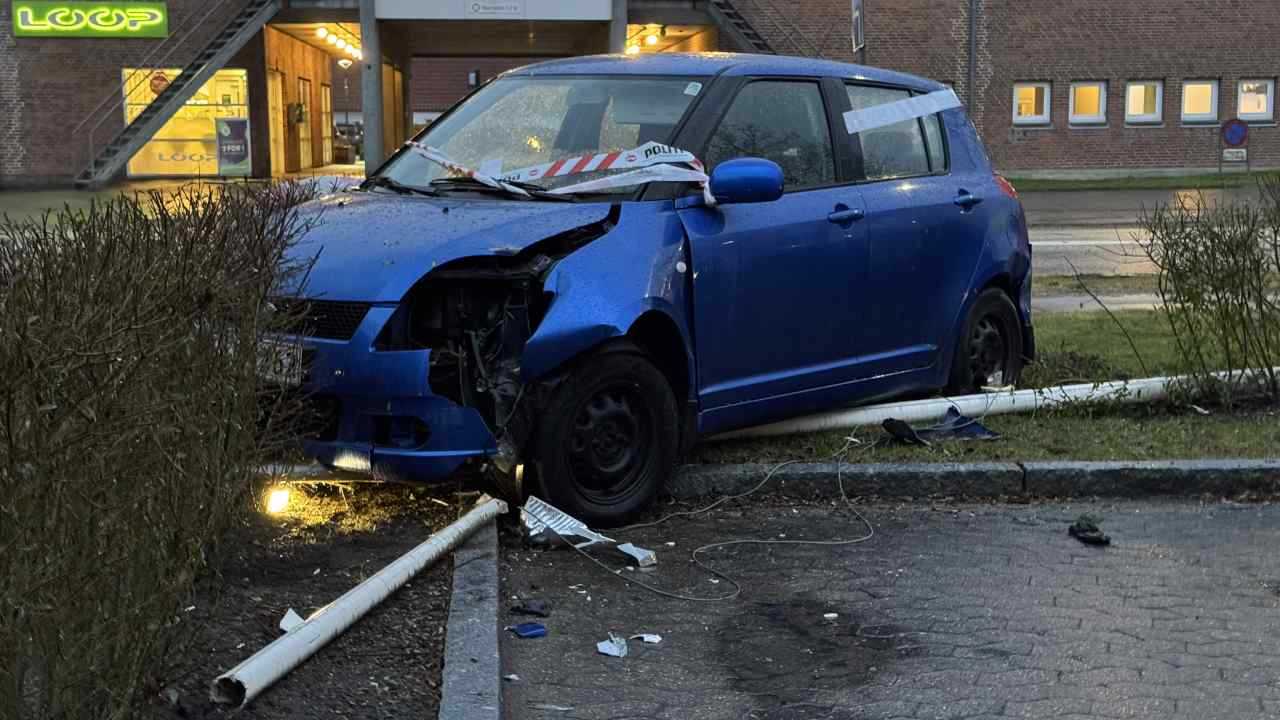 Agency Køretur endte galt fredag 27. feb 2026 Share on Facebook Tweet on Twitter Sønderjylland: Fredag aften holder en blå Suzuki Swift parkeret i en hæk hvor den bl.a. har ramt et par flagstænger samt en lampestander på Møllemærsk i Aabenraa. /local eyes/Fredag 27. feb 2026 / 106754