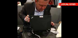 Lars Løkke spilder kaffe ud over sin computer