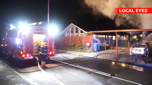 Alarmen om ildløs i en bil indløb kort før kl. 23, søndag aften, og det forlød i første omgang at beboerne i huset ikke kunne komme ud af huset på grund af branden.