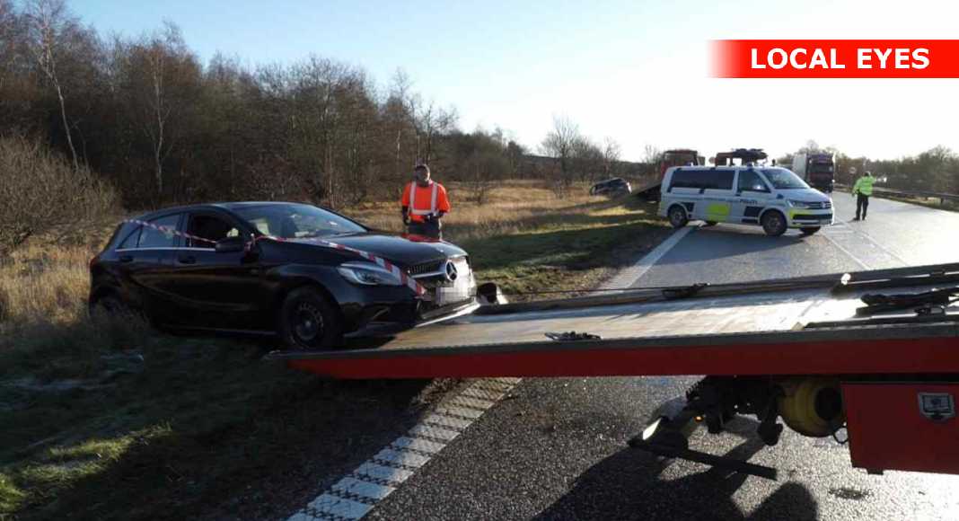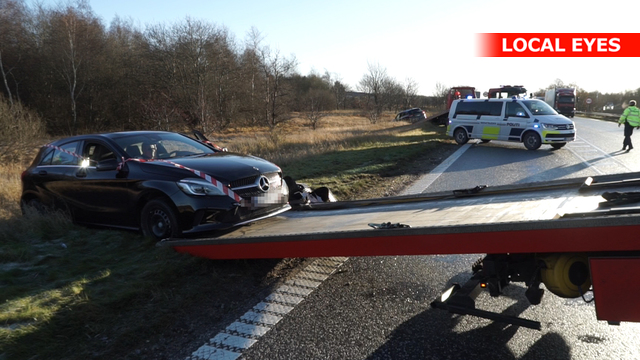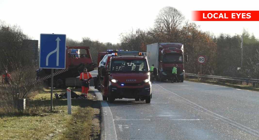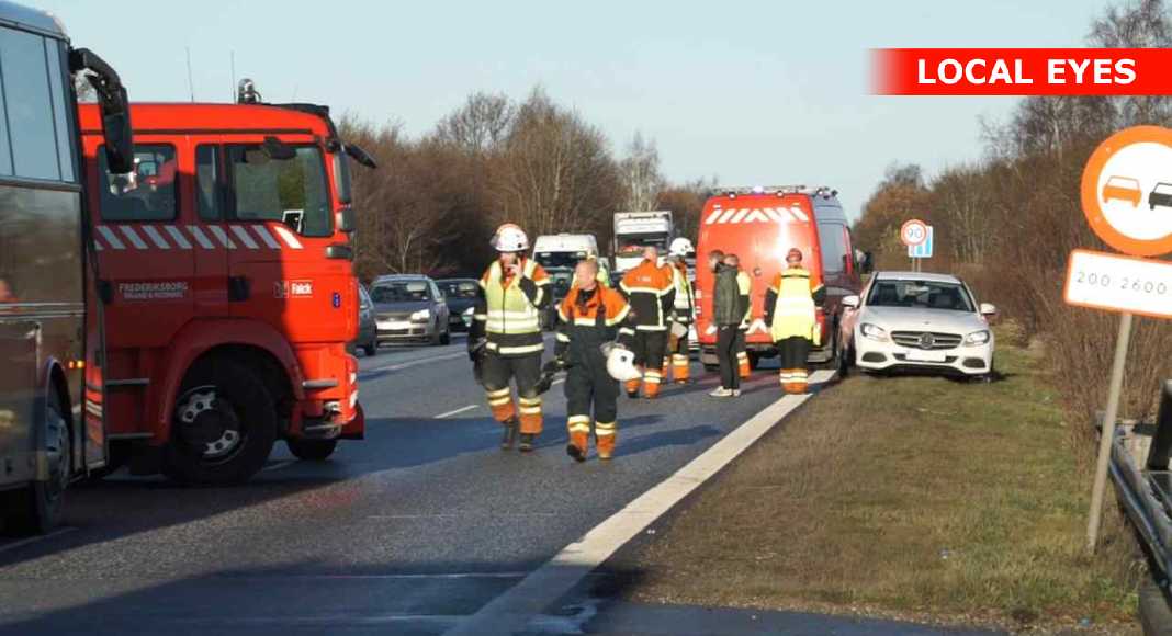 Først var det et uheld som skete i det sydgående spor af motortrafikvejen, lidt syd for Overdrevsvejen omkring kl. 09.20. Her blev tre personer fastklemt i en bil og måtte frigøres af brandvæsnet.