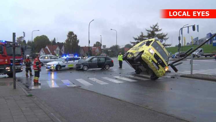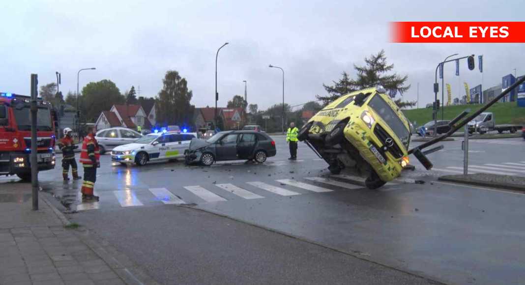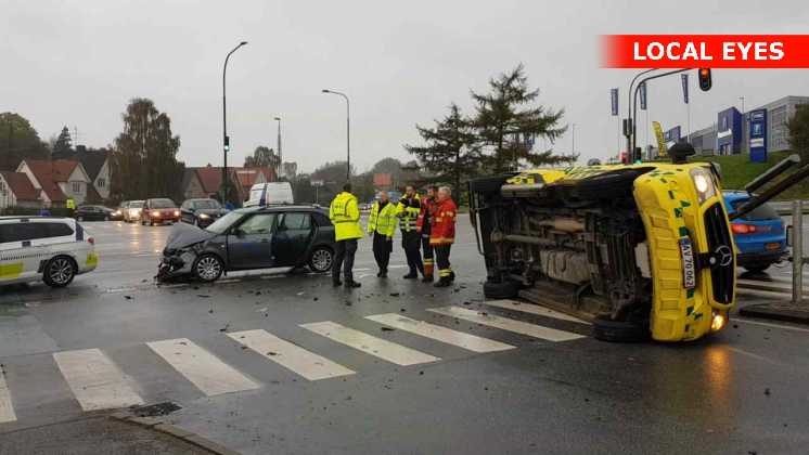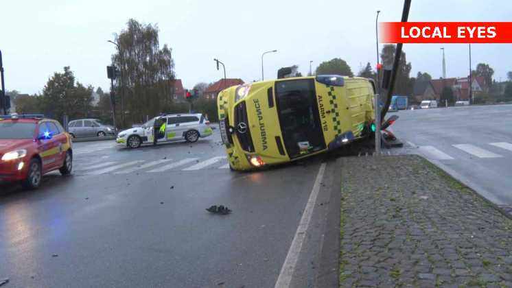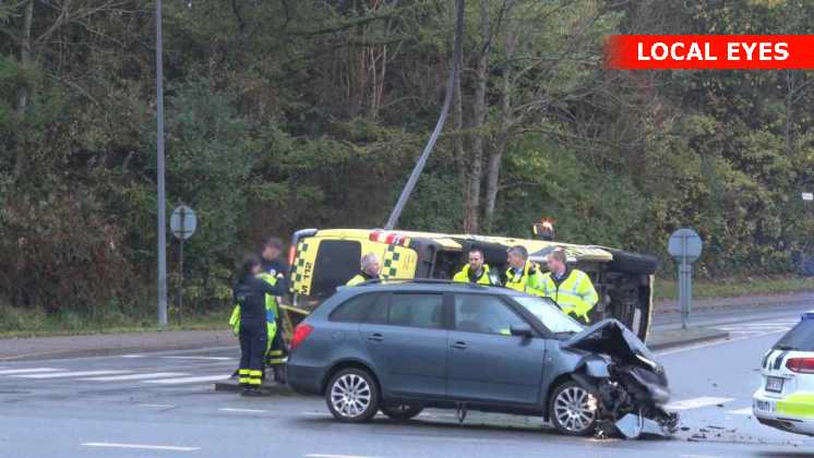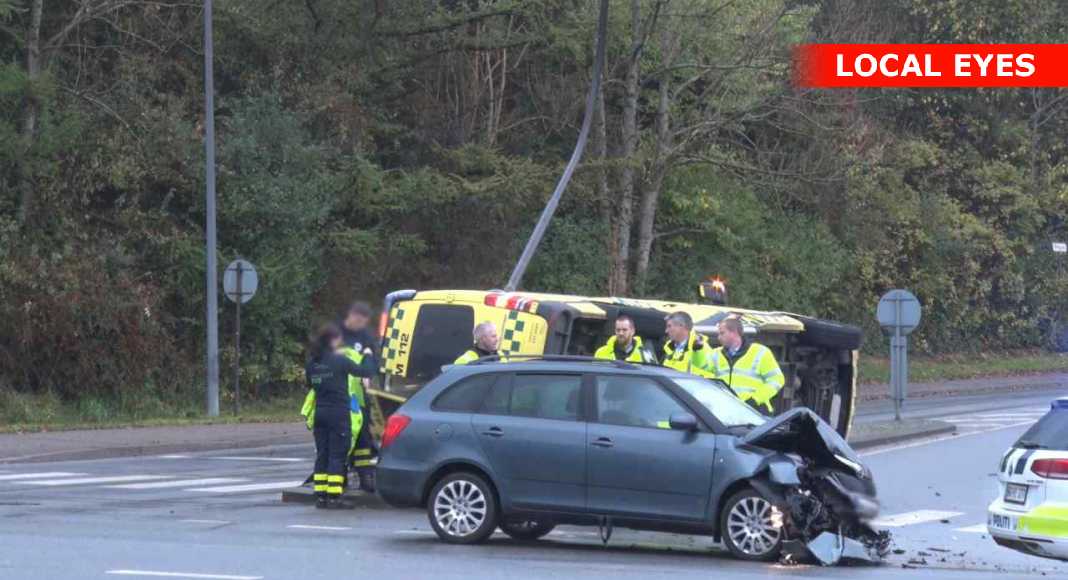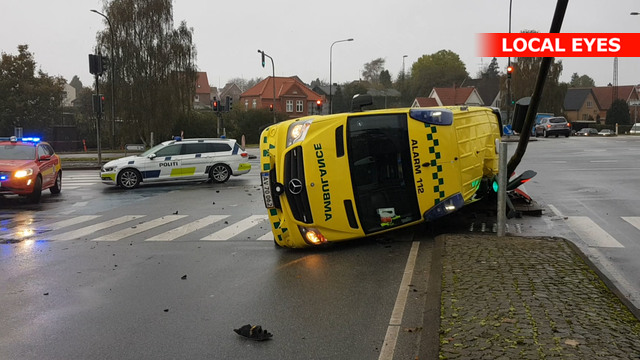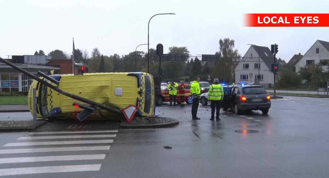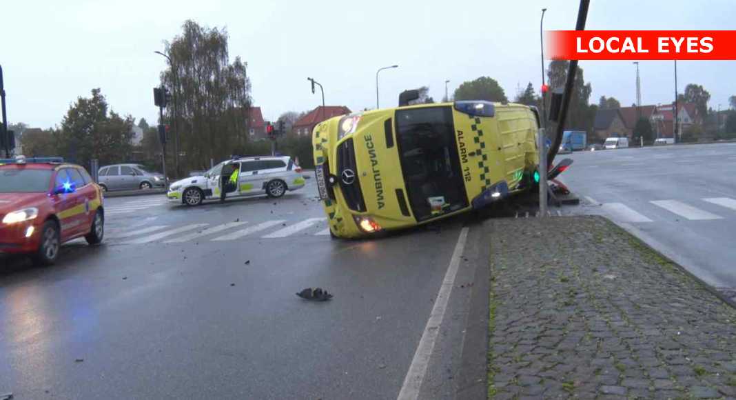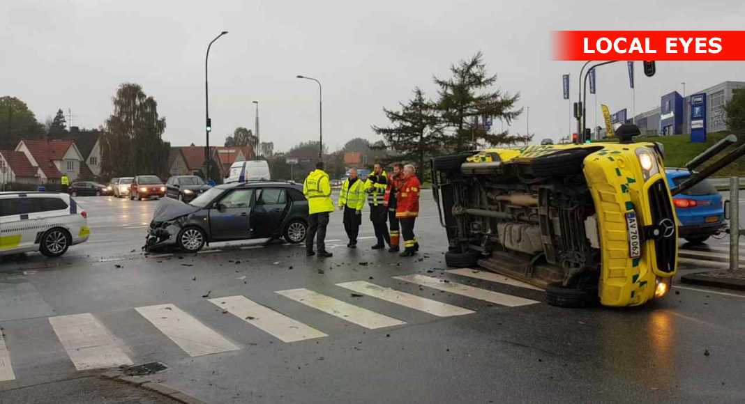 Her lå en ambulance væltet om på siden. Ambulance var kørt ud i krydset med udrykning men var alligevel blevet torpederet af en bilist.