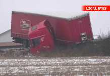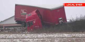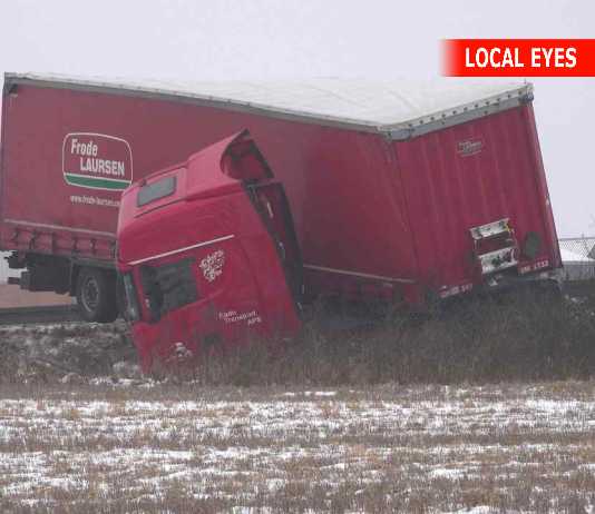 Sønderjylland: Lastbil kørt igennem autoværn på E45 Den Sønderjyske Motorvej nord for Østerløgum rasteplads i nordgående retning.img:m##742280##