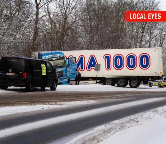 Firehjulstrækker ligger på taget midt på hovedvejen nær Svenstrup