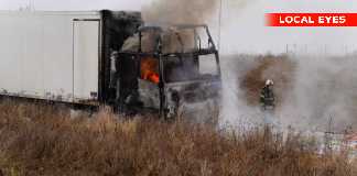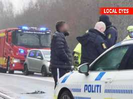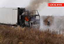 Brændende lastbil spærre vej