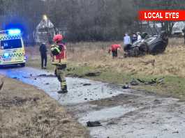 Søndag eftermiddag køre en personbil ind i et kørende arbejdsredskab på Suså Landevej ved Buske.