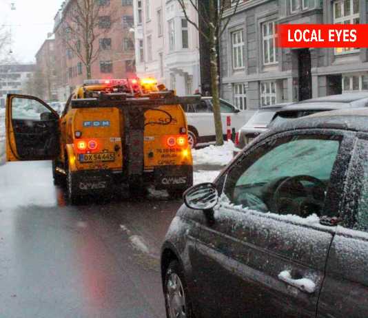 Nedfalden sne ødelægger forruden på bil på Frederiksberg