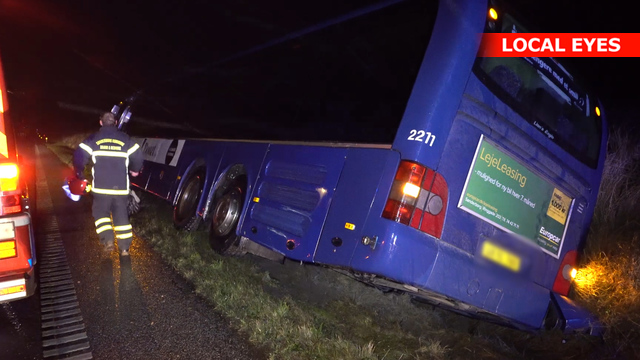 Bus med passagerer kørte i grøften pga. vindtryk fra modkørende lastbil.