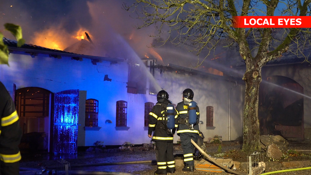 Personer på stedet oplyser at 15 heste blev reddet ud men 2 af hestene løb tilbage i den brændende bygning.