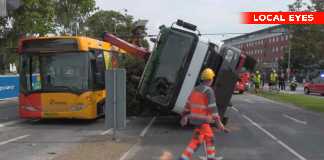 Lastbil med kran væltet ned i bus