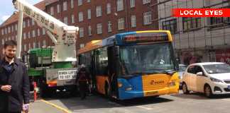 Bus påkører kranvogn i København