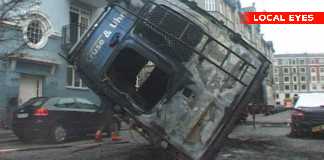 Jagtvej 69. Murbrokker med politiekscorte gennem København