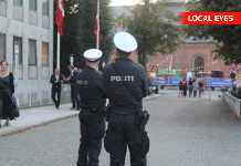politiet bevogter Århus rådhus. Da vigtig personer er til sted ! Byrådsmedlemmer borgmester osvimg:m##710829##
