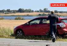 Uheld med 3 biler. Munkebo vej helt spærret.Bilinspektør arbejder på stedetimg:m##709329##