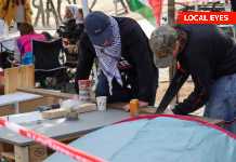 Propalæstinensere bygger trækonstruktion på Rådhusplads: Stor teltlejr på tredje dag