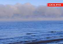 Fra Rågeleje kan man ikke se Sverige som normalt, derimod koger vandet og en skyformation skjuler fuldstændig udsigten til den svenske kyst.img:m##697278##
