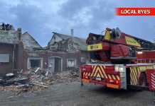 Selve branden er slukket, men en bunke af foderpiller som ligger og ulmer i kælderen driller brandfolkene lidt. Brandvæsnet kan ikke få adgang til...