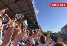 God stemning blandt OB’s fans i pausen mellem OB og AaB efter OB’s 1-0 føring i de første 45 minimg:m##679579##