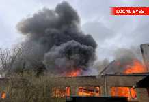Lagerlokale/værksted brænder voldsomt, flammer står ud af vindruer og døre, taget brændt væk....