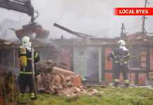 Totalt udbrændt stråtækt hus midt i Gårslev by