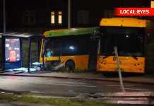 Voldsomt så det ud – harmonika bus røget gennem autoværn og dernæst smadret busskur