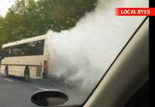 Tirsdag formiddag kørte denne rygende skolebus igennem Odense.Local Eyes har modtaget disse mobiloptagelser af en skolebus, hvor røgen står ud fra bagenden.img:m##474065##Bussen...