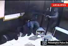 Overvågnings-video viser en bevæbnet mand som skyder og sårer tre personer på en kinesisk restaurant i Philadelphia, USA.Den bevæbnet mand forsøger flere gange...