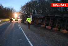 En lastbil væltede mandag aften på Præstbovej i Nordjylland.Uheldet er angiveligt sket, da chaufføren får hjulene ud i rabatten og forsøger at dreje lastbilen...