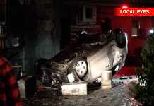 Voldsom ulykke: Bil styrtede 4 meter ned og landede på taget