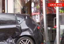Tre biler i sammenstød og ender i butik – en person muligvis stukket af