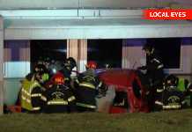 Bilist fastklemt: Kørte i høj fart ind i en bygning