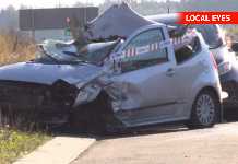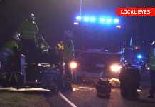 Føreren af en lastbil havde ikke fået kranen slået helt ind, så den ramte en motorvejsbro, og betonstykker fra broen ramte en bil, som...