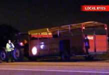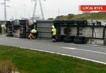 Lastbil fyldt med kød væltet i rundkørsel