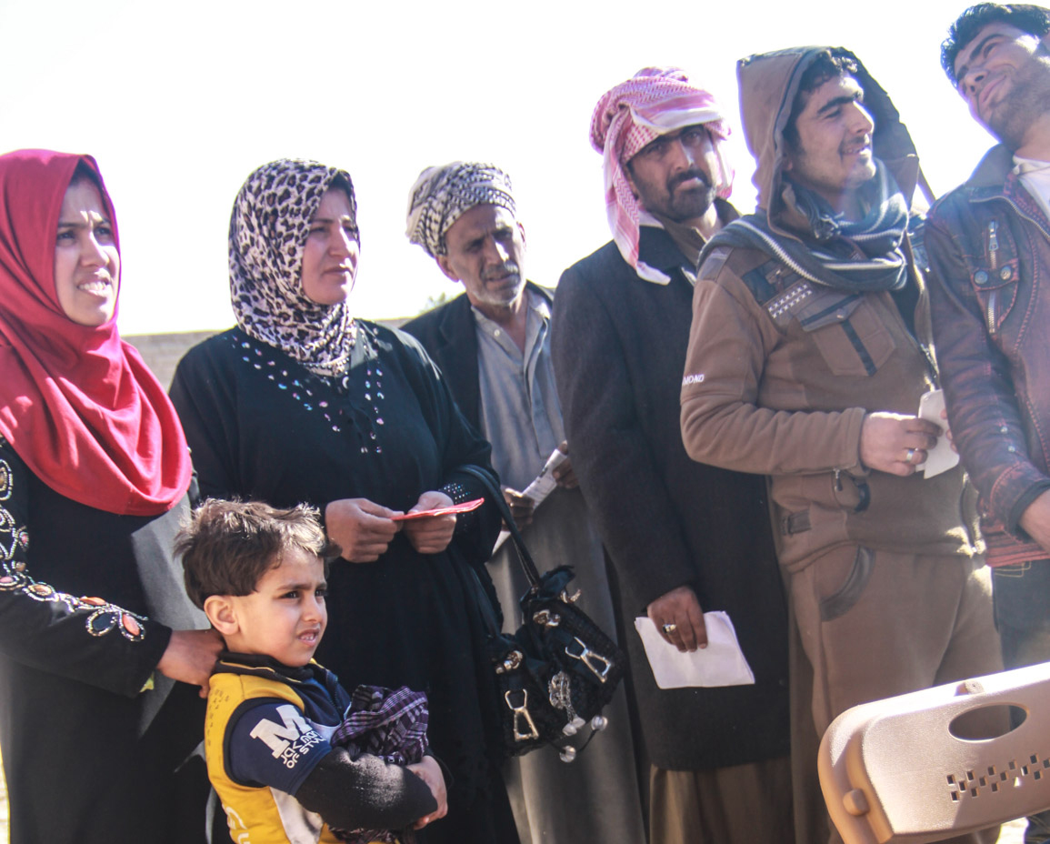 Modtagerne er dels mennesker på flugt fra kampene i det indre Mosul, dels mennesker, der kommer tilbage til deres hjem efter en kort flugt til flygtningelejre uden for Mosul. Deres hjem er stærkt beskadiget af måneders beskydning, hyppige luftangreb og plyndringer for alt af værdi. Familier finder ly i de huse, der er nogenlunde intakte, men ueksploderet ammunition på de omgivende marker er stadig en udfordring.