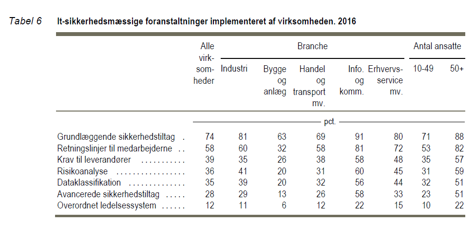 tallene for private danske virksomheders investeringer i it-sikkerhed. 27 pct. af de danske virksomheder med 10 eller derover ansatte øgede deres investeringer i it-sikkerhed i 2015, mens 70 pct. af virksomhederne havde uændret niveau fra 2014-2015. Kun 3 pct. af virksomhederne sænkede deres investeringer i it-sikkerhed i perioden. I alt havde 82 pct. af de danske virksomheder implementeret it-sikkerhedsmæssige foranstaltninger i 2015.