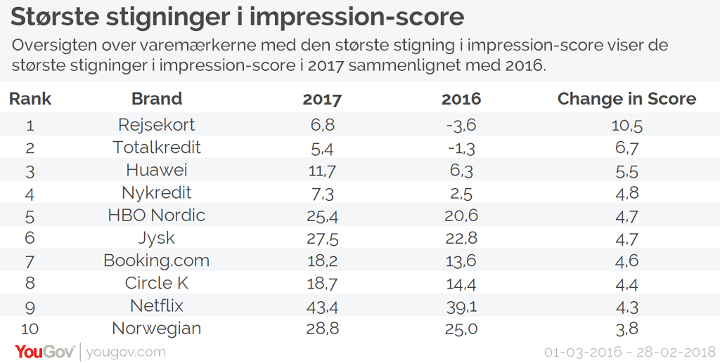 Oversigten over varemærkerne med den største stigning i impression-score blandt kvinder viser de varemærker, der har de største stigninger i impression-score fra 1. marts 2017 til 28. februar 2018 sammenlignet med samme periode året før.