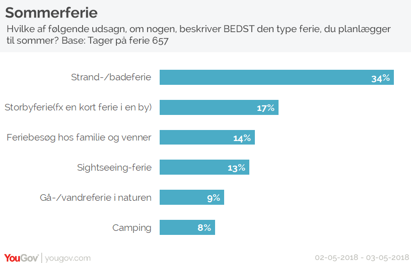 44% vil tage på ferie i udlandet, og kun hver femte (21%) har planlagt at holde ferien i Danmark. Hver femte har dog endnu ingen planer (15%) eller ved ikke, hvad sommerferien skal bruges på (5%), og måske kan det varme sommervejr få overbevist dem om, at en ferie i Danmark er vejen frem.