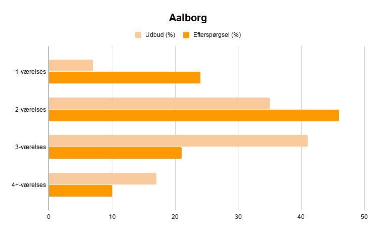 Kigger man på undersøgelsen, fremgår det at over halvdelen af de boligsøgende efterspørger to-værelses lejligheder i Aalborg. Dog har udbuddet svært ved at følge med på lige netop denne boligtype, og udgjorde kun 35% af de ledige boliger i 2018. Derfor har mange boligsøgende svært ved at få fingrene i lige præcis den bolig, de søger.