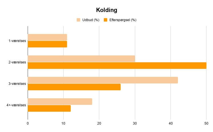 Sagen er dog en helt anden, hvis man kigger på de to-værelses boliger. Lige netop her, ligger Kolding nemlig i blandt top tre i efterspørgsel, og er en af de byer, hvor det er sværest at få fat i en to-værelses. Her er der nemlig 20% flere boligsøgende end der er udbudte boliger. Hvis man har svært ved at få fingrene i en to-værelses bolig, kan det derfor betale sig at gå på kompromis, ved at søge i omegnen af Kolding, eller betale lidt mere for en bolig med et ekstra værelse.
