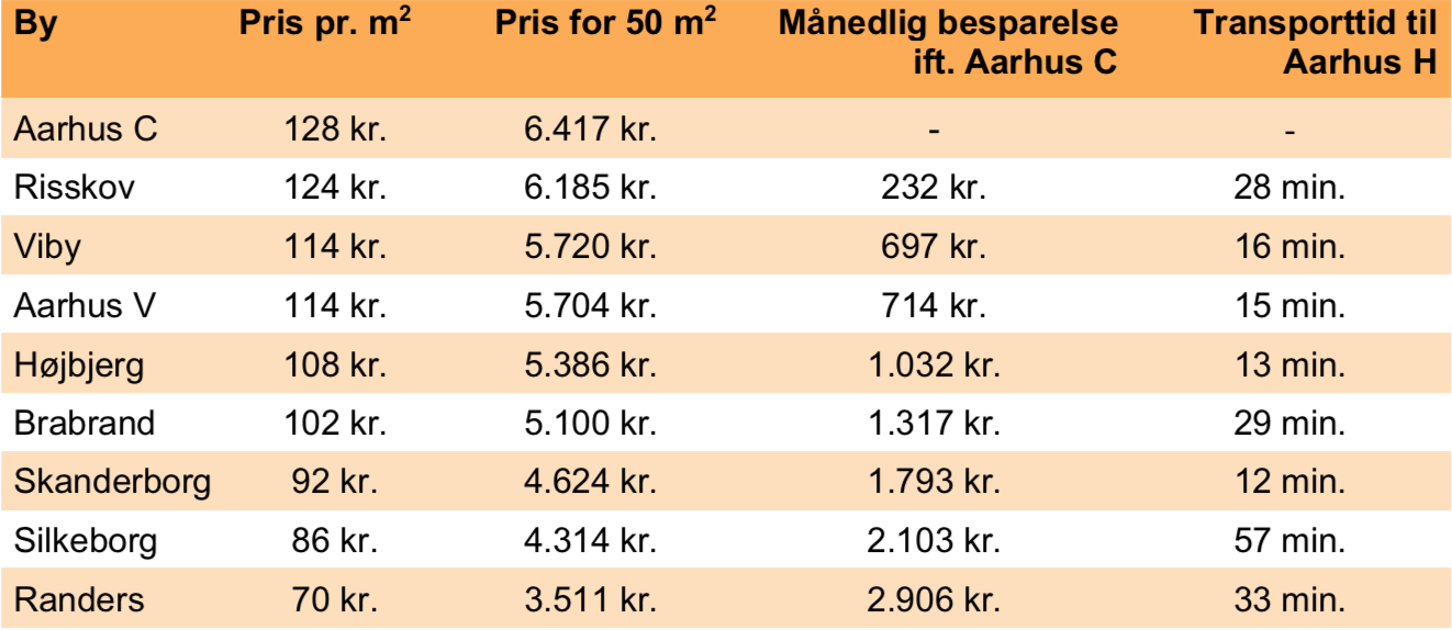Studerende kan allerede spare mellem 500 og 1000 kr. i husleje så snart de bosætter sig i eksempelvis Aarhus V, Viby eller Højbjerg. For at det virkelig batter skal de studerende dog være villige til at flytte endnu længere væk fra centrum. Kun 12 minutters togtid fra Aarhus kan studerende bosætte sig, og spare gennemsnitligt 1.793 kr. på husleje hver måned. Ved at bosætte sig i Randers vil studerende månedligt kunne spare helt op til 2.906 kr. på omkring en halv times transporttid til uddannelsesstedet i Aarhus.