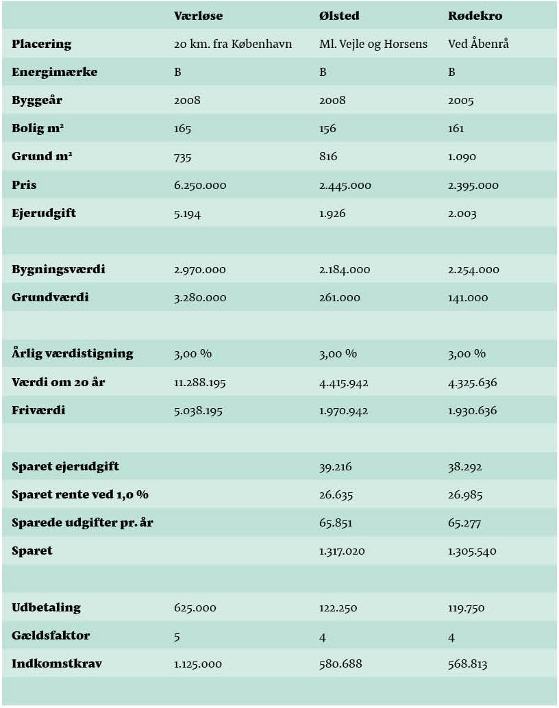 Vælger man at bosætte sig i eller i umiddelbar nærhed af en de store byer – i dette eksempel i Værløse, vil det være dyrt i ejerudgifter og renter på lån. Omvendt giver en løbende værdistigning en stor friværdi på sigt, som man kan nyde godt af, når man bliver pensionist.
