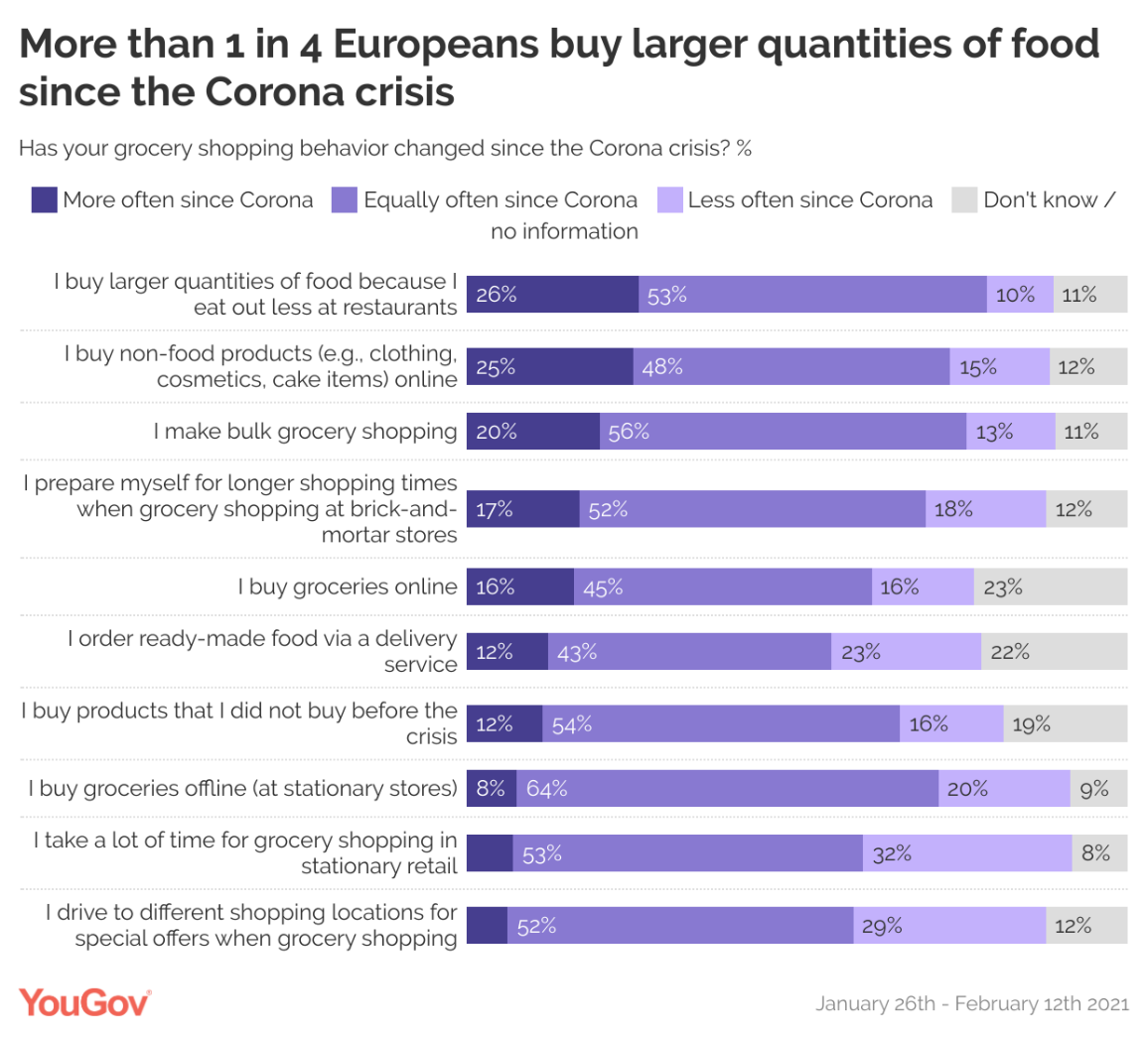 Under pandemien har mange forbrugere ændret købsadfærd. 1 ud af 4 europæere angiver således, at de køber større mængder af mad (26%) og oftere køber nonfoodprodukter (såsom tøj, kosmetik og plejeprodukter) online (25%), siden coronapandemiens udbrud.