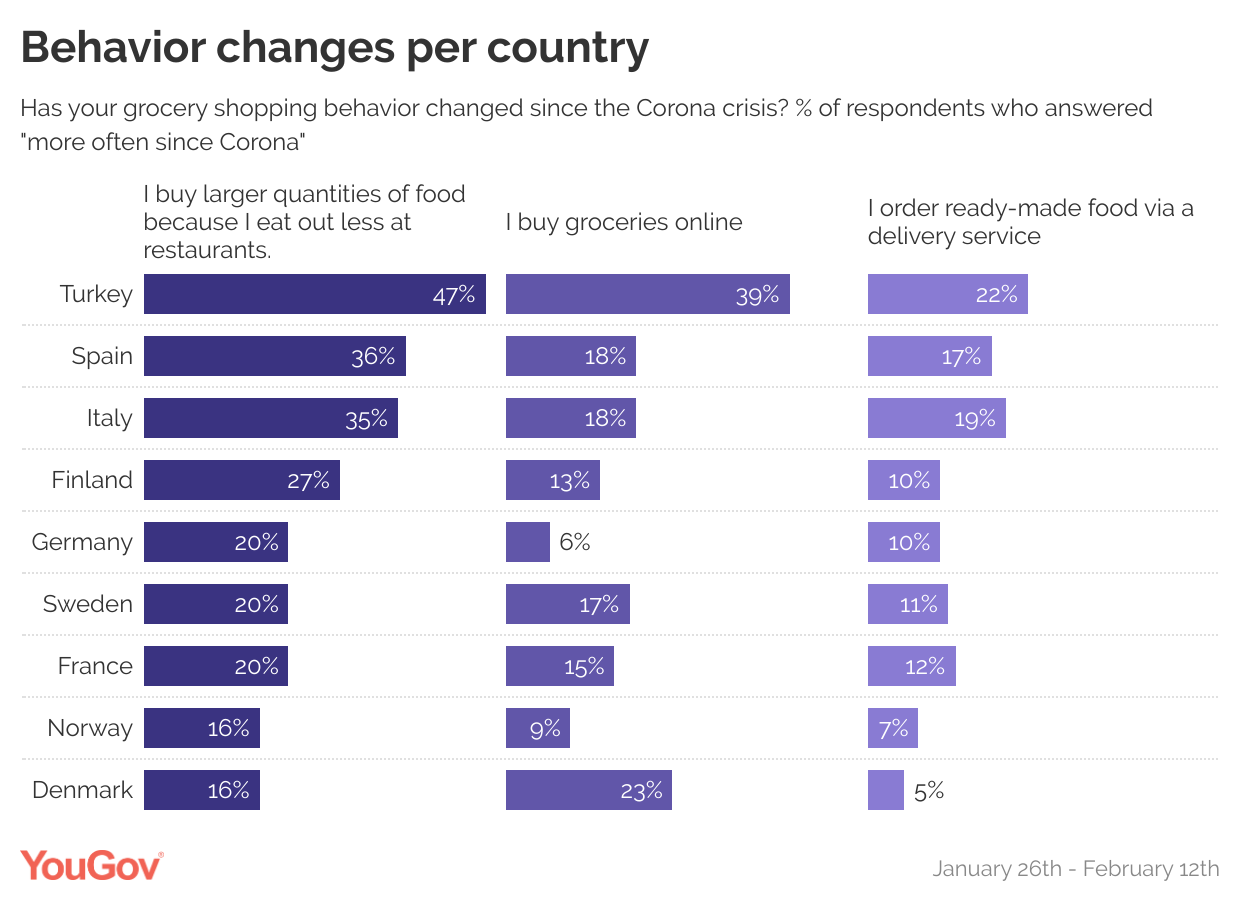 Tyrkere ligger konsekvent i top, når det kommer til at gøre følgende oftere: købe dagligvarer online (39%), bestille færdigretter (22%), købe stort ind (38%), købe større mængder af mad (fordi man spiser mindre ude på restaurant) (47%) og købe nonfoodprodukter online (49%).