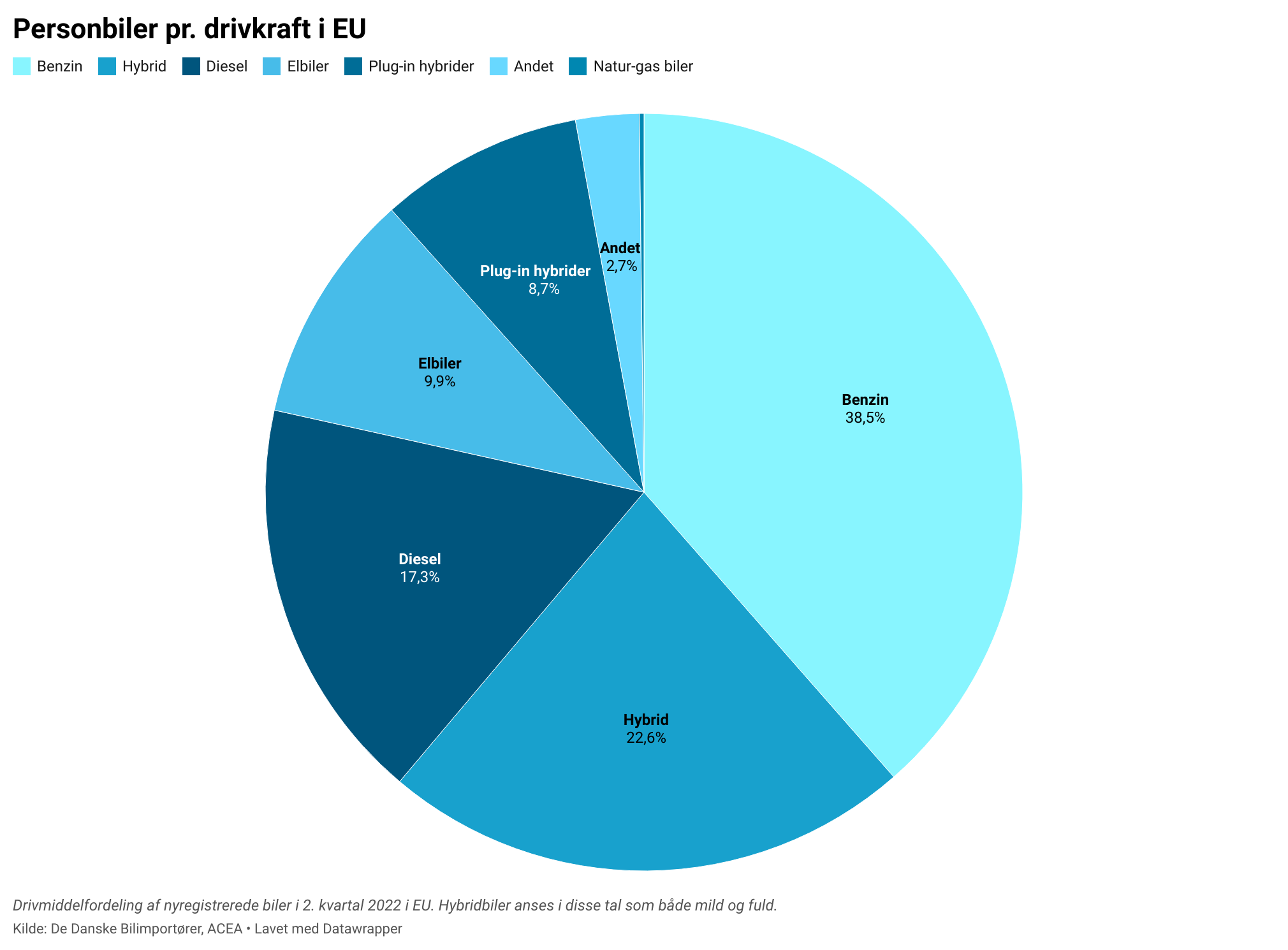 Andelen af elbiler udgør 9.9 procent i 2. kvartal, mens de i 1. kvartal var på 10 procent. Den samme historie gælder for plug-in hybriderne, som har haft et minimalt fald i markedsandel fra 8.9 til 8.7 procent. Derved har de konventionelle fossildrevne biler genvundet en lille andel af markedet i 2. kvartal.